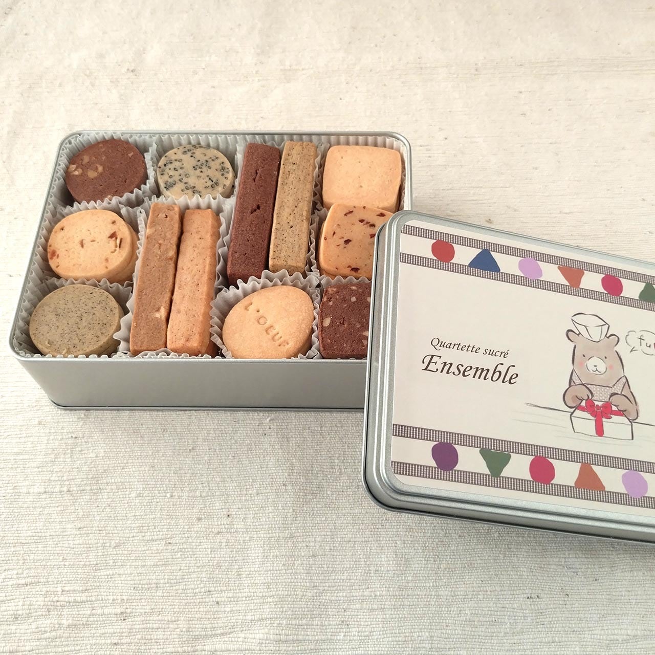G-1アンサンブル小【シルバー缶深】 「カルテットシリーズ」の中から、定番の3シリーズを網羅した欲張りな詰合せを「アンサンブル」と名付けました。 12種類のクッキーをモザイクのようにきっちりと詰め合わせた美しい缶入りクッキーは、贈り物にぴったりの品です。 1缶12種類71枚入り 缶の大きさ:12.4cm×16.8cm×5.2cm 賞味期限約1か月 熨斗紙は用意しておりません。 贈り物の場合は、「ご依頼人のご住所とお電話番号を記載したカード」を添えてお届けいたします。 手提げ袋がお入り用でしたらこちらから↓ https://oeuf.base.ec/items/67068722 Qartette(カルテット)は四重奏。 4種のクッキーの詰合せです。 4つの味のハーモニーをお楽しみください。 ^^^^^^^^^^^^^^^^^^^^^^^ カルテット・ヴィヴァント Vivante(ヴィヴァント)は「元気な」という意味。 子供たちも大好きな定番のクッキーの詰合せです。 カリカリ、サクサクの四角いクッキーです。 アマンドショコラ:ココア&アーモンド 紅茶:ベルガモットの香りの「アールグレイ」 クランベリー:バター&クランベリー ココ:ココナッツ 原材料:小麦粉 マーガリン(生活クラブ) 砂糖 鶏卵 バター ココナツ アーモンド クランベリー ココア 紅茶 牛乳 香料 アレルゲン:小麦 卵 乳 大豆 アーモンド 同じ施設で、ごま オレンジ りんご くるみも扱います。 ^^^^^^^^^^^^^^^^^^^^^^^ ^^^^^^^^^^^^^^^^^^^^^^^ カルテット・エレガント Elegante(エレガント)は「優雅な」という意味。 細いスティックです。エレガントに召し上がれ。 ラズベリーショコラ:ココア&ラズベリー ピンクペッパー:ピンクペッパー&バター ノワゼットカフェ:ヘーゼルナッツ&コーヒー 紅茶:ベルガモットの香りの「アールグレイ」 原材料:小麦粉 マーガリン(生活クラブ) 砂糖 鶏卵 バター ヘーゼルナッツ ココア ラズベリーパウダー インスタントコーヒー 牛乳 紅茶 ピンクペッパー 香料 アレルゲン:小麦 卵 乳 大豆 同じ施設で、アーモンド ごま オレンジ りんご くるみ も扱います。 ^^^^^^^^^^^^^^^^^^^^^^^ ^^^^^^^^^^^^^^^^^^^^^^^ カルテット・カルム Calme(カルム)は「穏やかな」という意味。 地味ですが「味わい深い」クッキーの詰合せです。 少し厚みのある丸型クッキーです。 ノワショコラ:ココア&くるみ 国産紅茶:「勝又苑」の無農薬紅茶 ポム:りんご&バター ごま:香ばしいごま 原材料:小麦粉 マーガリン(生活クラブ) 砂糖 鶏卵 バター りんご砂糖煮 くるみ 黒ごま ココア 国産紅茶 香料 アレルゲン:小麦 卵 乳 大豆 りんご ごま くるみ 同じ施設で、アーモンド オレンジも扱います。 ^^^^^^^^^^^^^^^^^^^^^^^ ^^^^^^^^^^^^^^^^^^^^^^^ たまごクッキー 「L'OEUF」のロゴを刻印した卵のクッキーです 原材料:小麦粉 バター 砂糖 鶏卵 ココア アーモンドパウダー 菜種油 牛乳 レモン 香料 アレルゲン:小麦 卵 乳 大豆 アーモンド 同じ施設で、ごま オレンジ りんご くるみも扱います。 ^^^^^^^^^^^^^^^^^^^^^^^ 主な原材料につきまして「ショップ情報」にも 生産者へのリンクなどを記載しております。 https://oeuf.base.ec/about F-1 ヴィヴァント【シルバー缶】 https://oeuf.base.ec/items/76040488 F-2 エレガント【シルバー缶】 https://oeuf.base.ec/items/76040738 F-3 カルム【シルバー缶】 https://oeuf.base.ec/items/76040833 G-1S アンサンブル特小【シルバー缶浅】 https://oeuf.base.ec/items/124455817 G-2 アンサンブル中【ホワイト缶】 https://oeuf.base.ec/items/76411034 G-3 アンサンブル大【ホワイト缶】 https://oeuf.base.ec/items/76411078